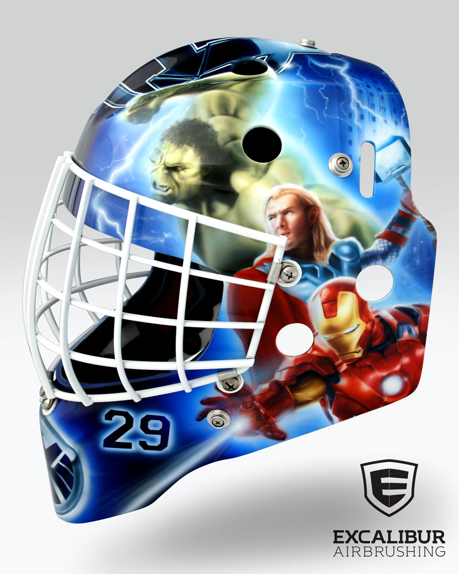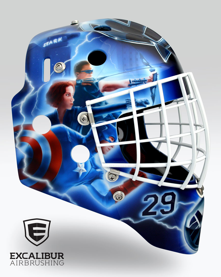 - Avengers goalie mask designed and airbrushed by Ian Johnson. #ianjohnsonart #excaliburairbrushing #goaliemasks #customairbrushing #airbrushartist #goaliemaskpainting #maskpainting #helmetpainting #customhelmets #customairbrushedgoaliemask #avengers