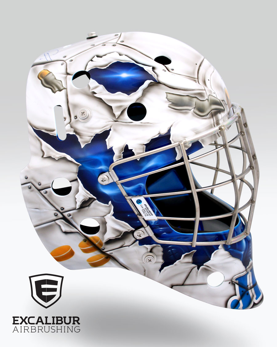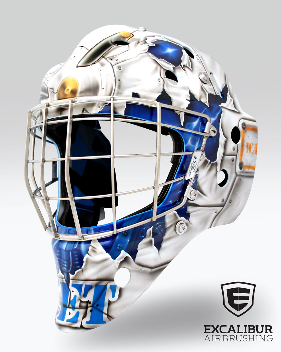 Avengers goalie mask designed and airbrushed by Ian Johnson