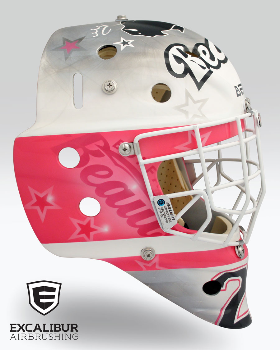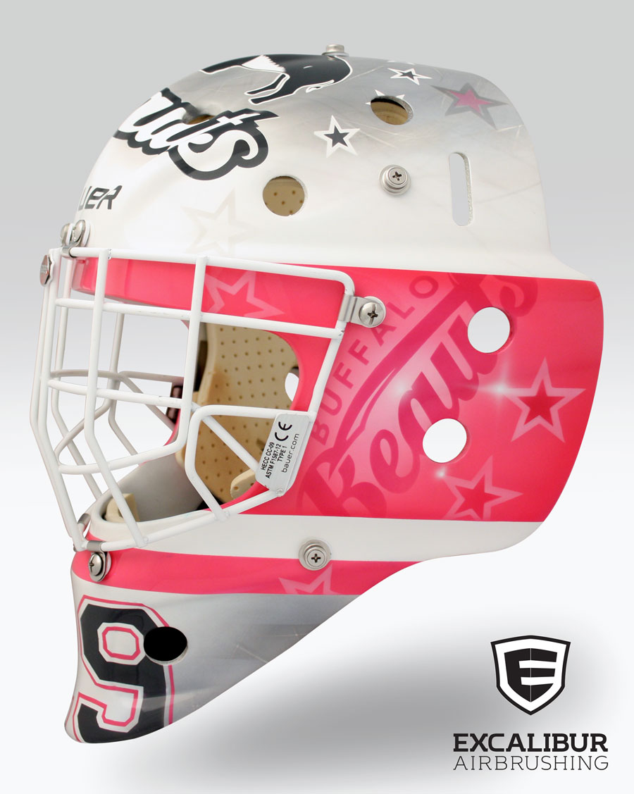 - "Buffalo Beauts" goalie mask designed and airbrushed by Ian Johnson #ianjohnsonart #excaliburairbrushing #goaliemasks #customairbrushing #airbrushartist #goaliemaskpainting #maskpainting #helmetpainting #customhelmets #customairbrushedgoaliemask #prettyandpink #girlgoaliesrock
