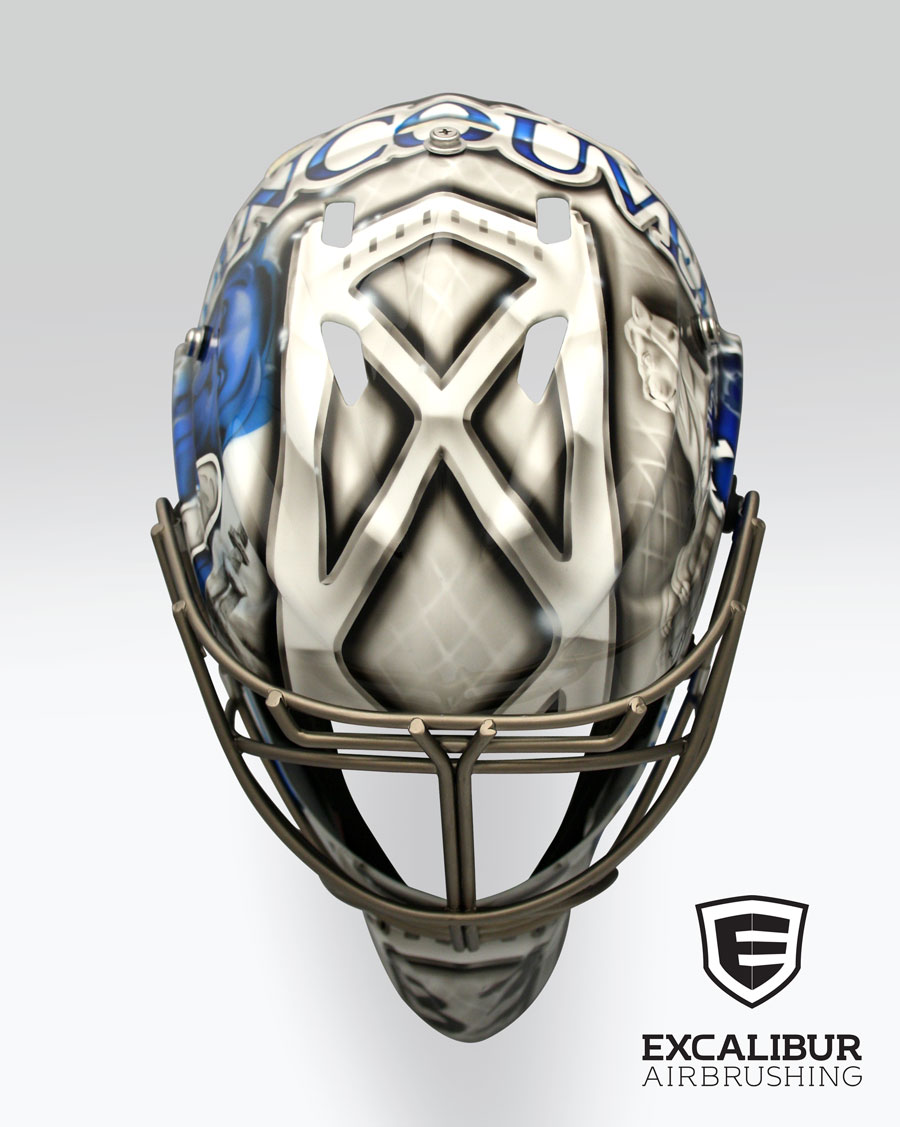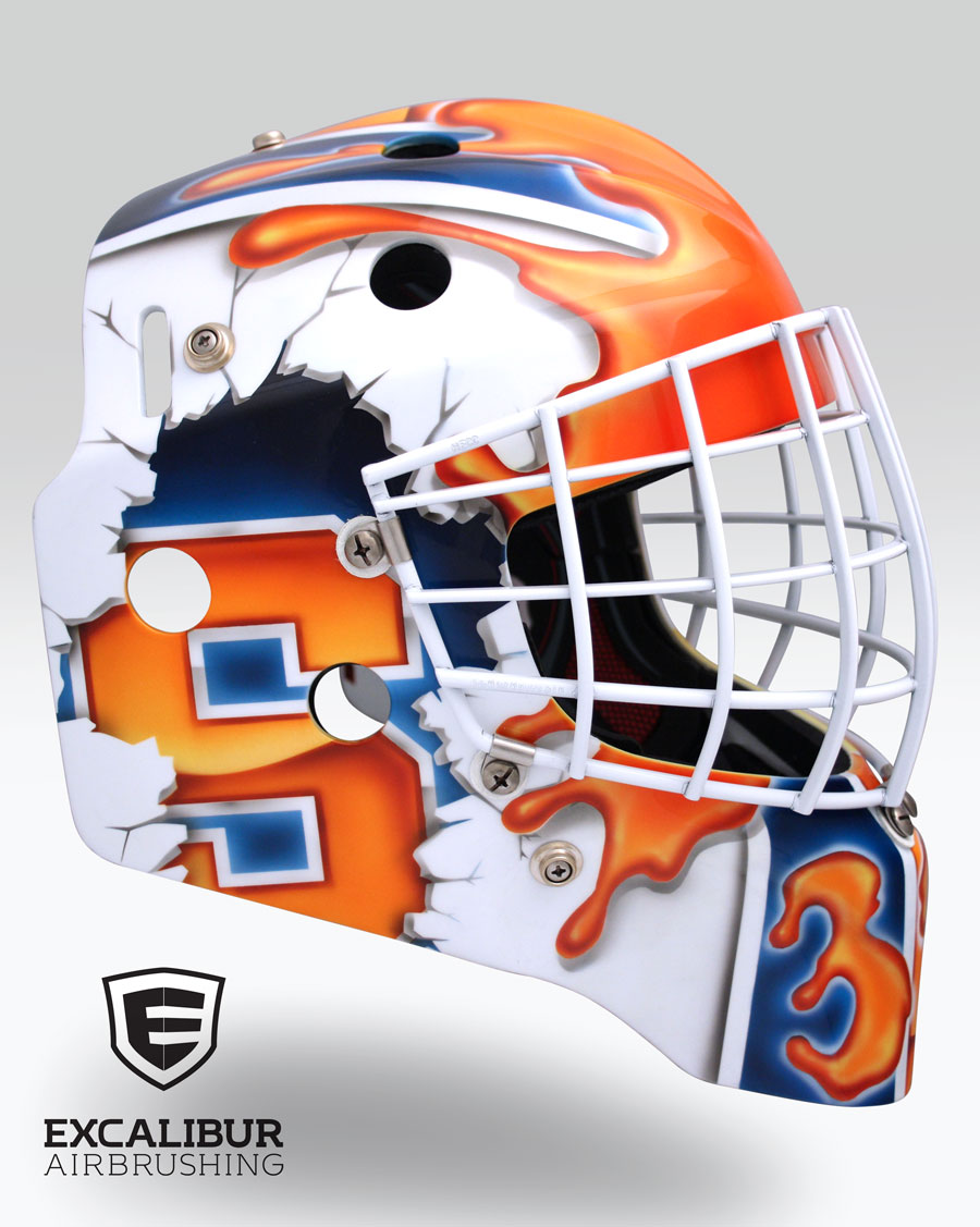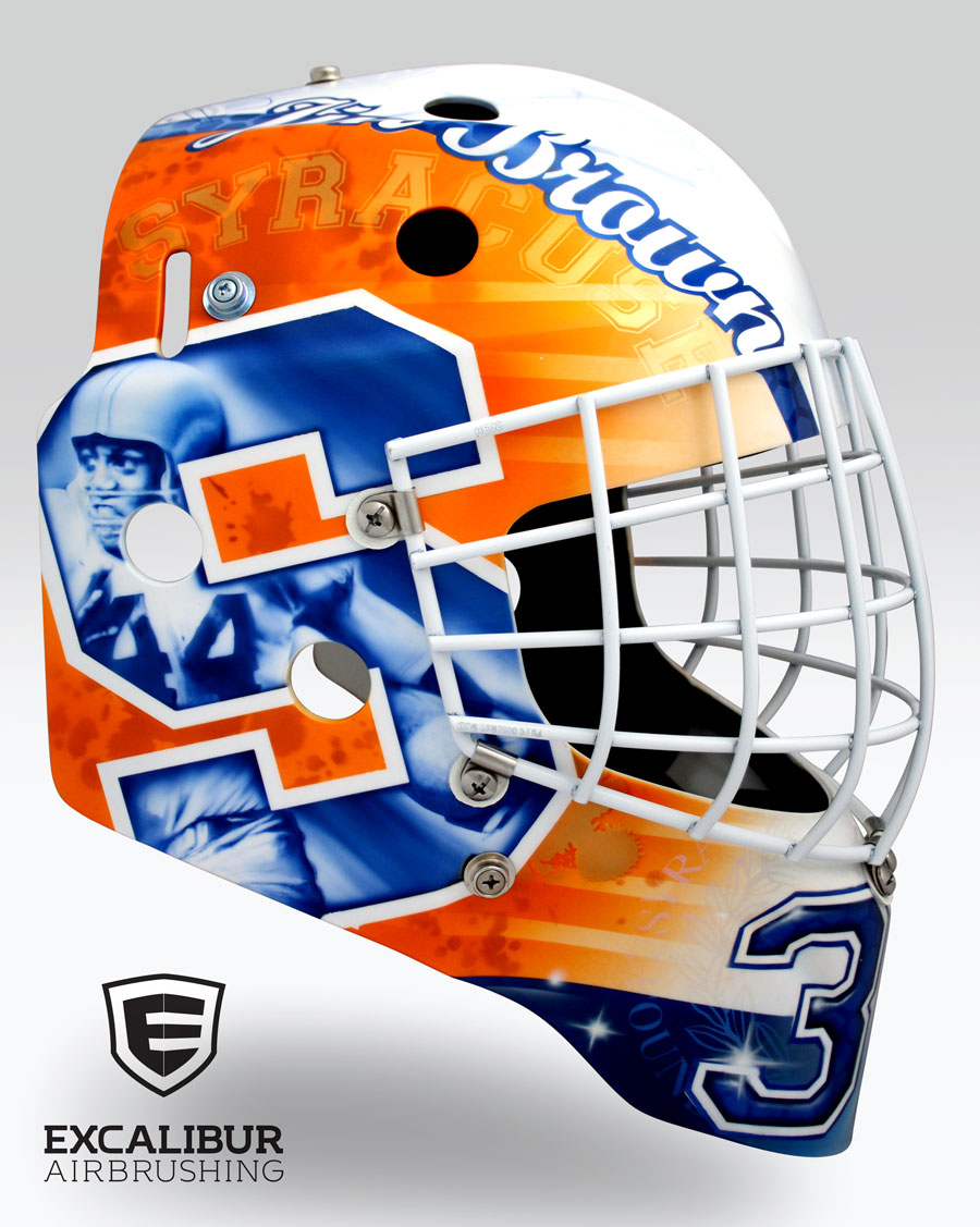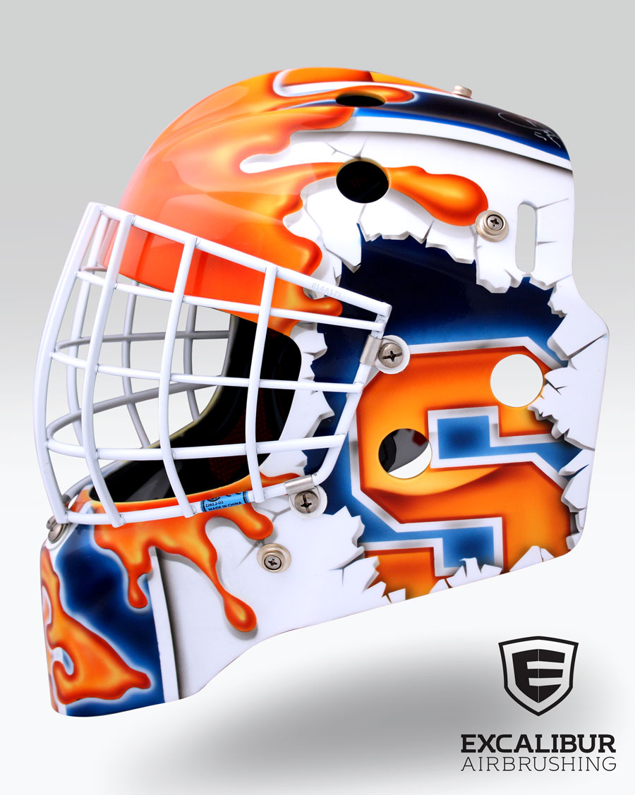 - Goalie mask for CHA University of Syracuse goalie, Jennifer Gilligan, designed and airbrushed by Ian Johnson #ianjohnsonart #excaliburairbrushing #goaliemasks #customairbrushing #airbrushartist #goaliemaskpainting #maskpainting #helmetpainting #customhelmets #customairbrushedgoaliemask