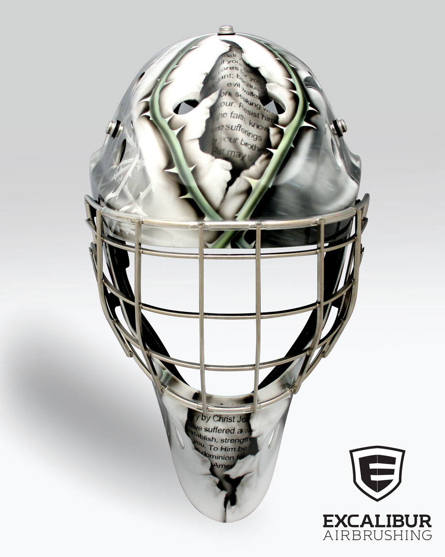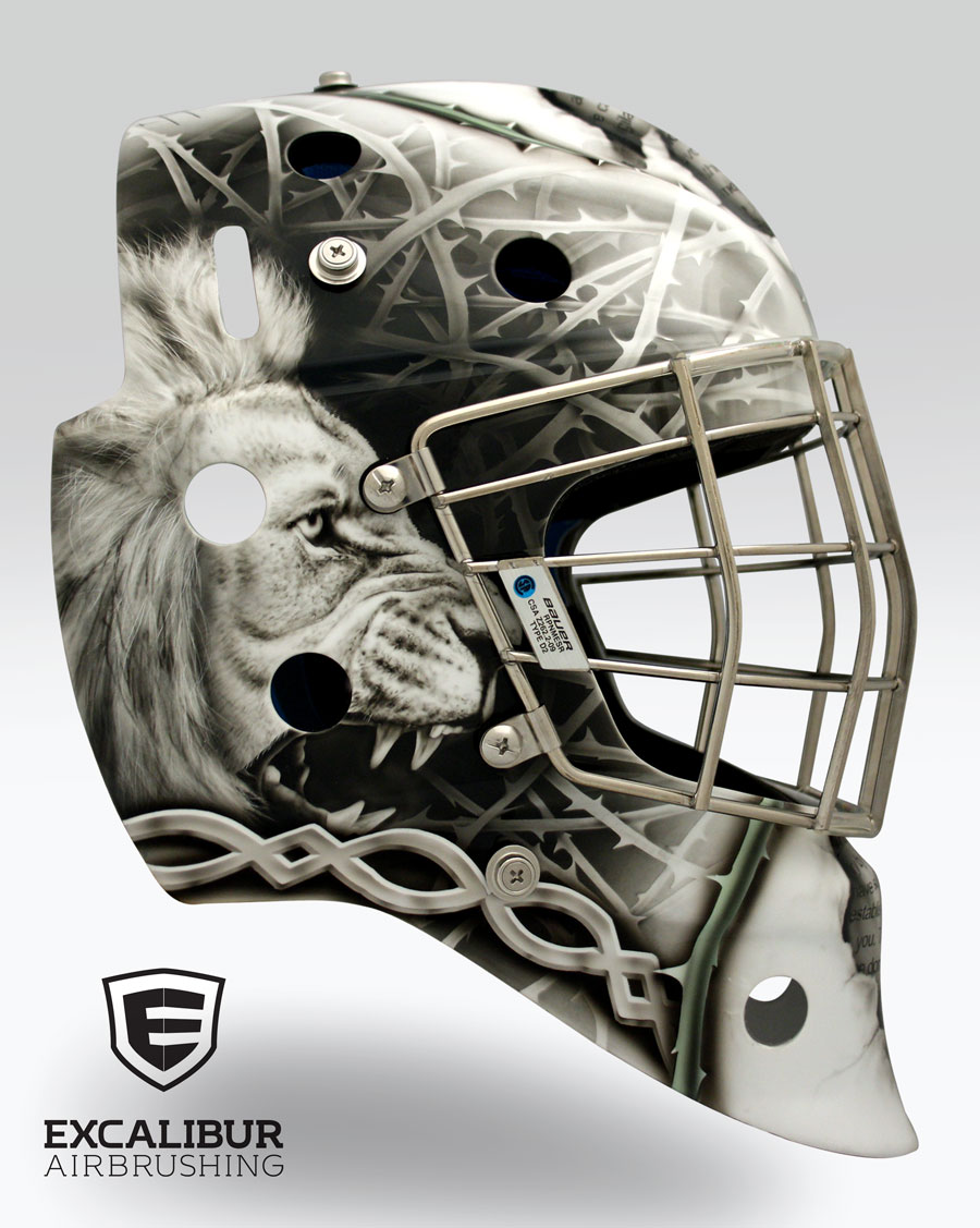 - "The Devil Prowls Around Like a Roaring Lion" goalie mask designed and airbrushed by Ian Johnson #ianjohnsonart #excaliburairbrushing #goaliemasks #customairbrushing #airbrushartist #goaliemaskpainting #maskpainting #helmetpainting #customhelmets #customairbrushedgoaliemask #christianart