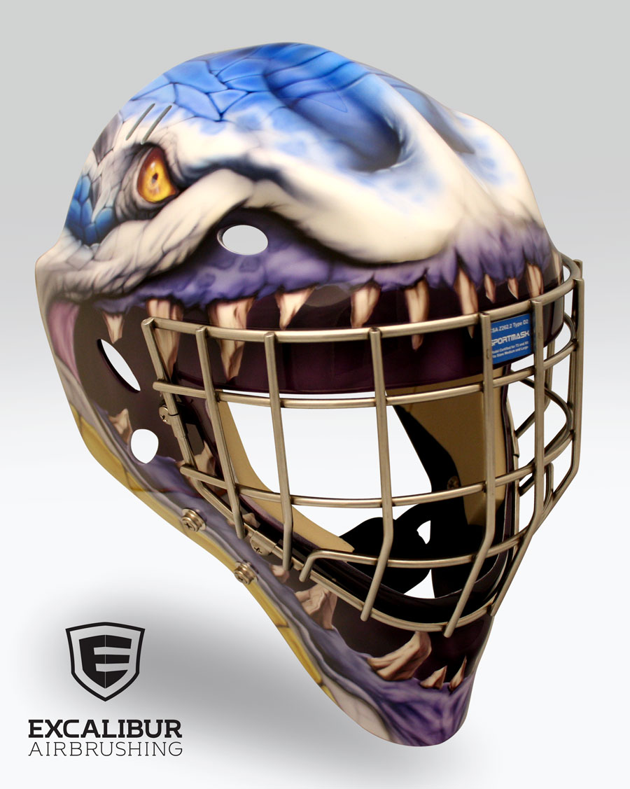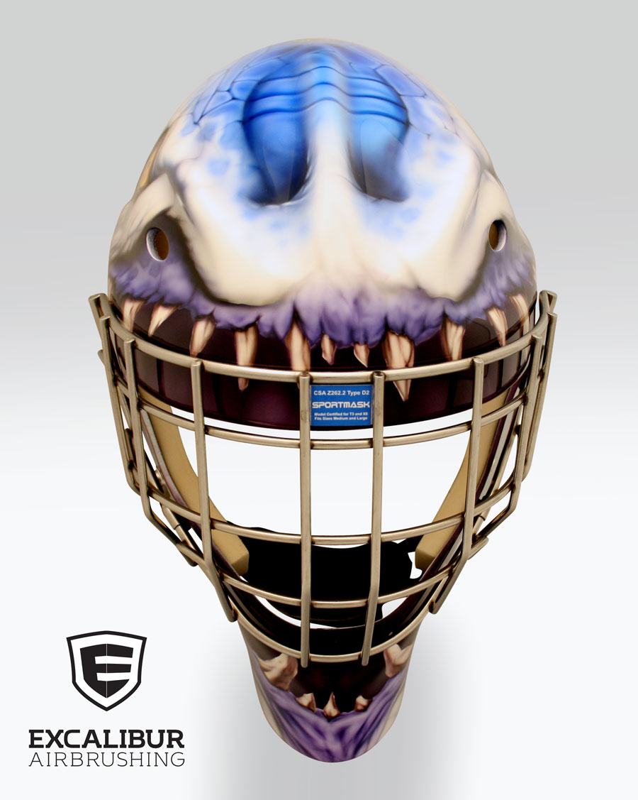 - "The Mighty Monster" goalie mask designed and airbrushed by Ian Johnson #ianjohnsonart #excaliburairbrushing #goaliemasks #customairbrushing #airbrushartist #goaliemaskpainting #maskpainting #helmetpainting #customhelmets #customairbrushedgoaliemask