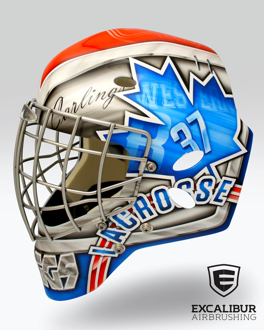 - Goalie mask for WLA Maple Ridge Burrards goalie, Frankie Scigliano, designed and airbrushed by Ian Johnson #ianjohnsonart #excaliburairbrushing #goaliemasks #customairbrushing #airbrushartist #goaliemaskpainting #maskpainting #helmetpainting #customhelmets #customairbrushedgoaliemask #lacrossehelmet