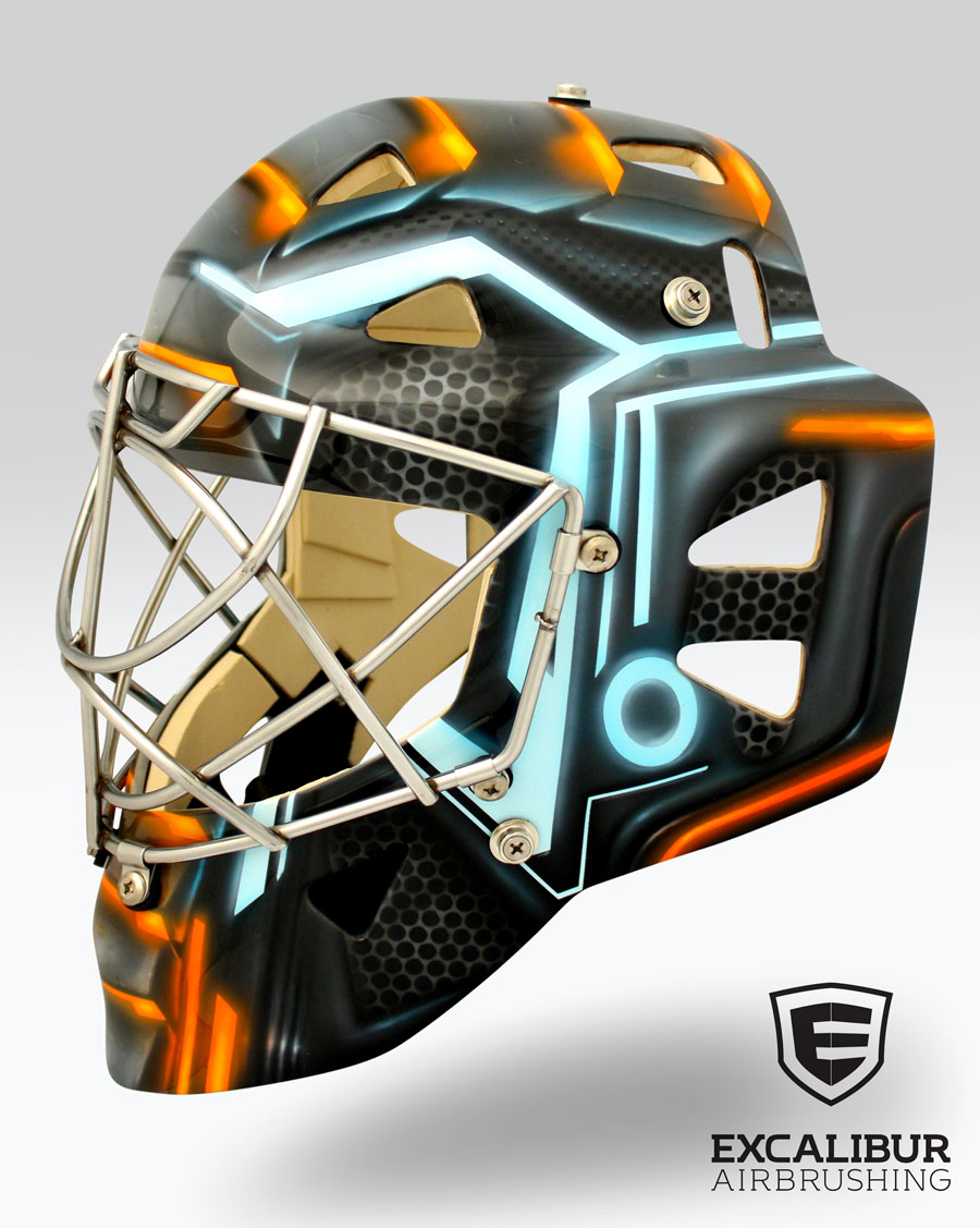 - Tron goalie mask designed and airbrushed by Ian Johnson. #ianjohnsonart #excaliburairbrushing #goaliemasks #customairbrushing #airbrushartist #goaliemaskpainting #maskpainting #helmetpainting #customhelmets #customairbrushedgoaliemask