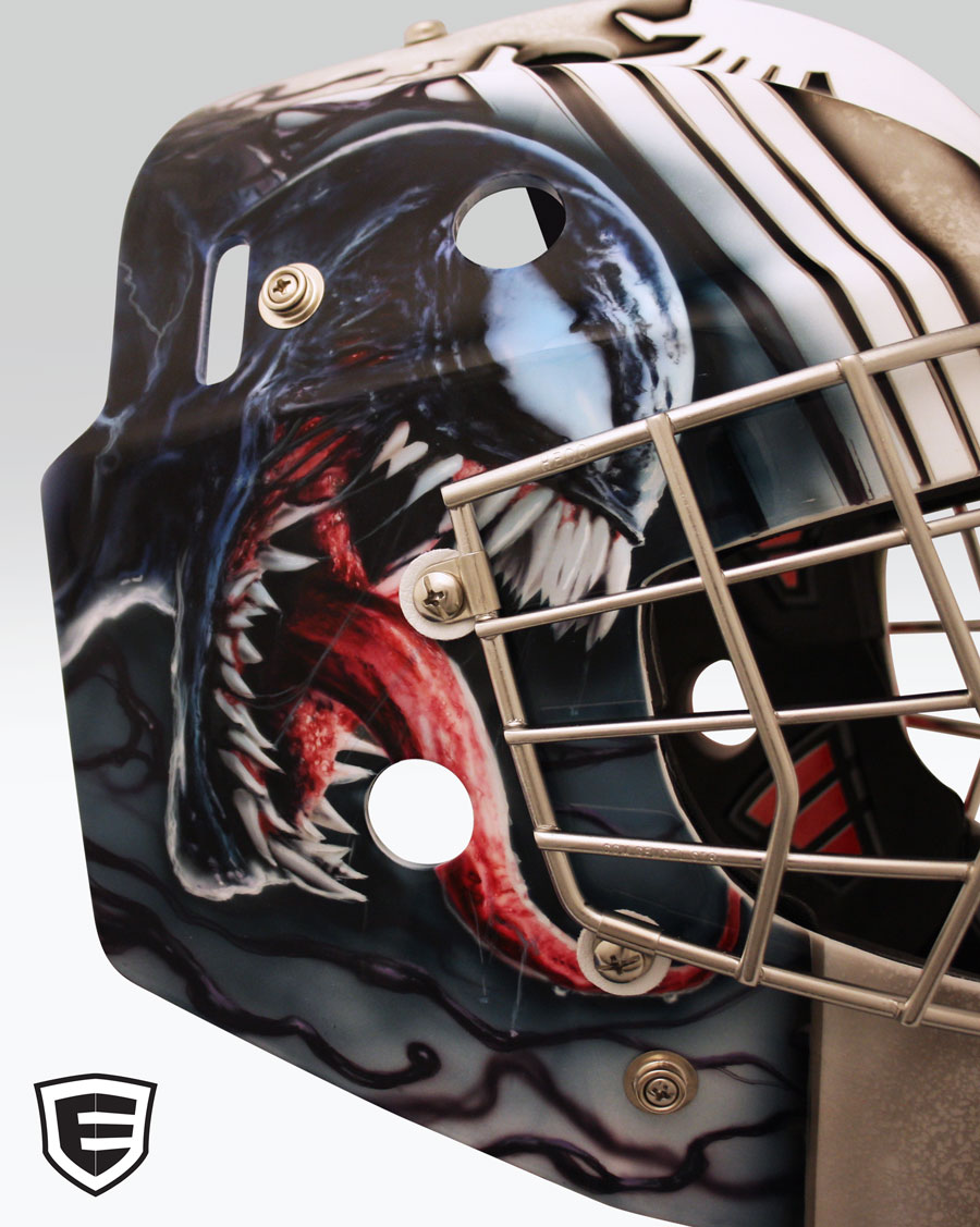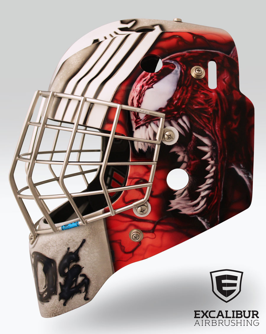 Venom vs Carnage goalie mask designed and airbrushed by Ian Johnson