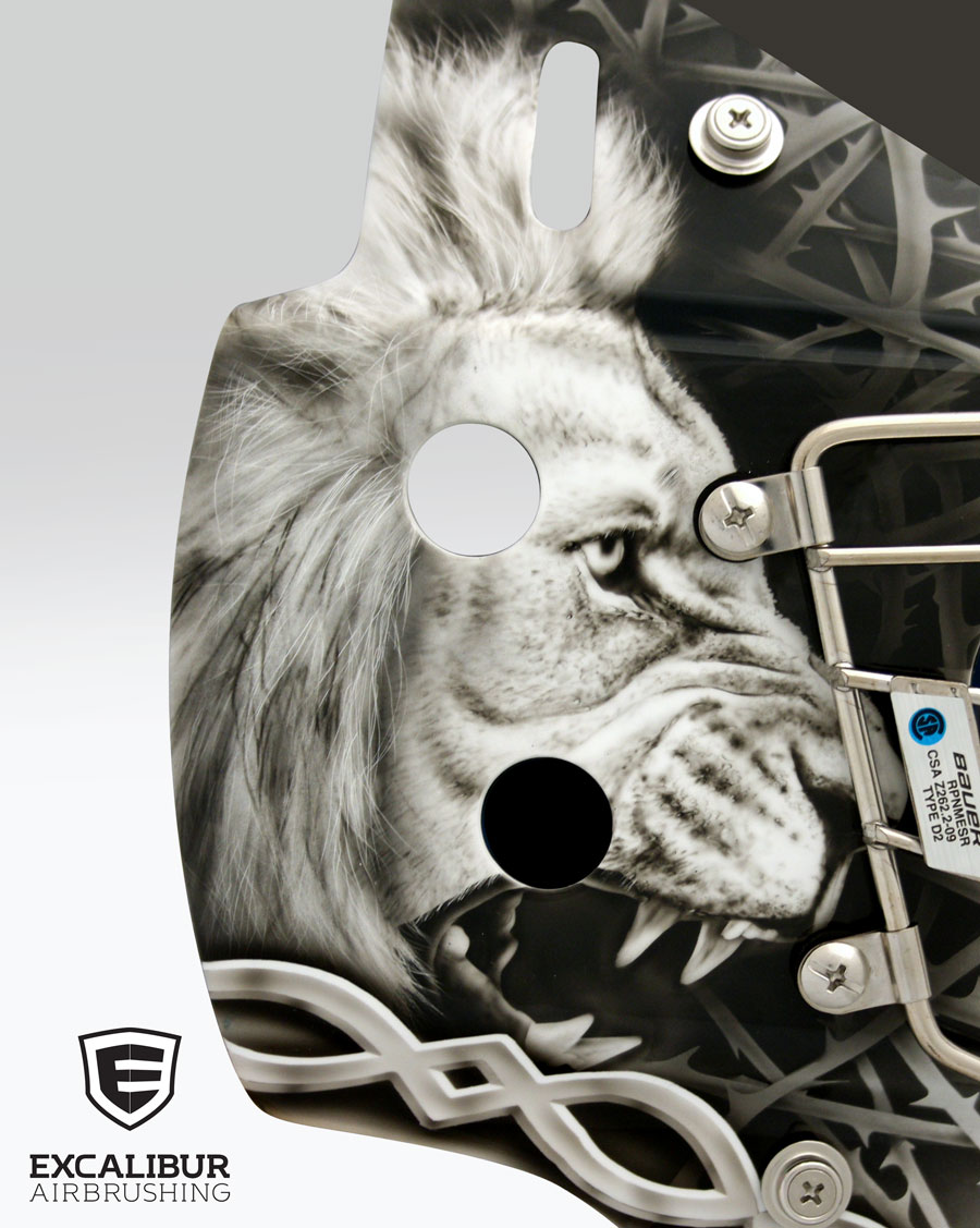 "The Devil Prowls Around Like a Roaring Lion" goalie mask designed and airbrushed by Ian Johnson